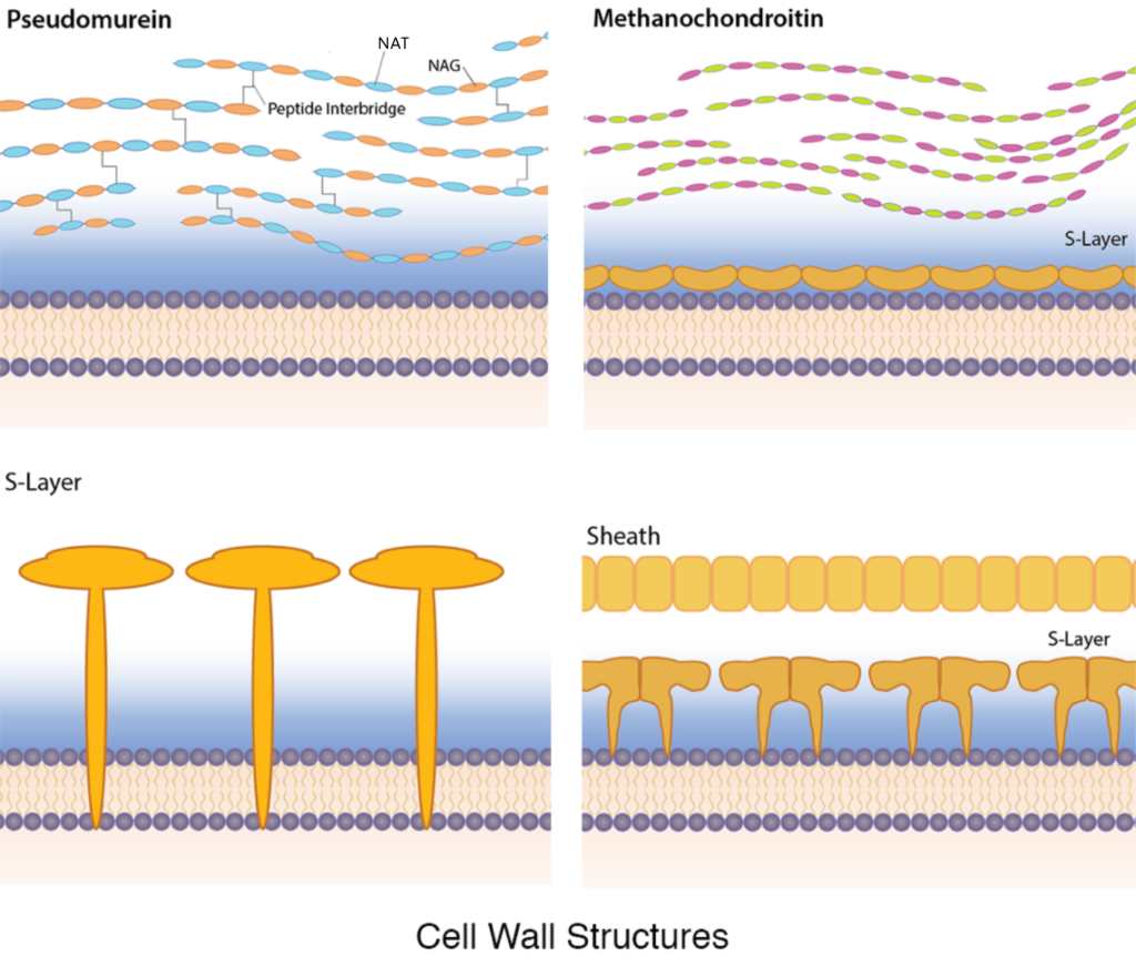 - Composed of pseudopeptidoglycan (pseudomurein), polysaccharides, proteins or glycoproteins