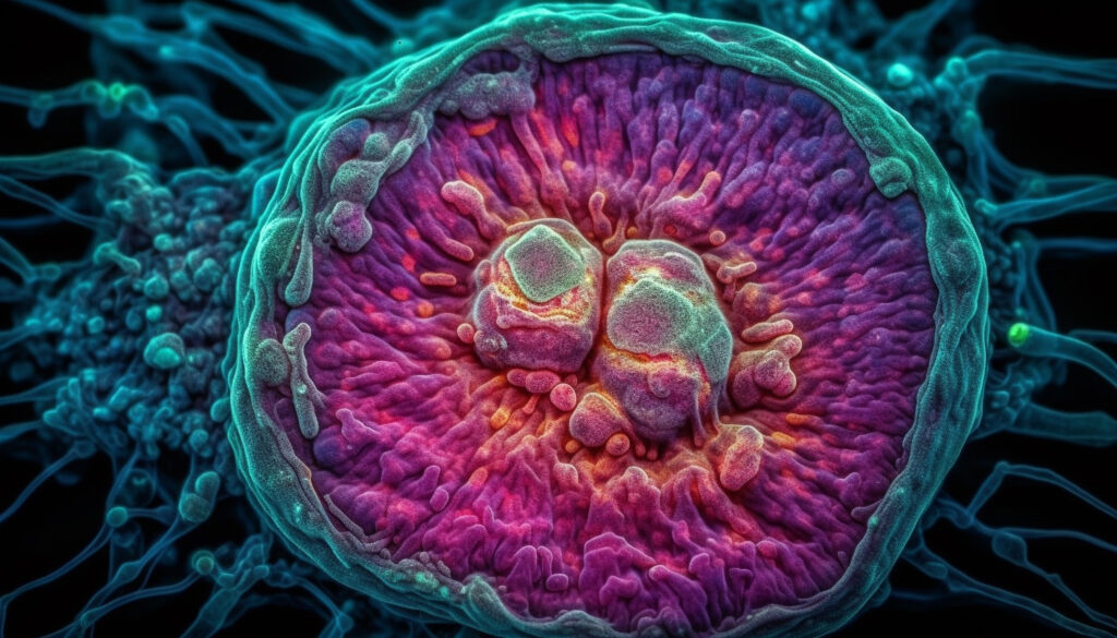 - Ring shaped nucleolus containing ribonucleoprotein granules and RNA fibrils.